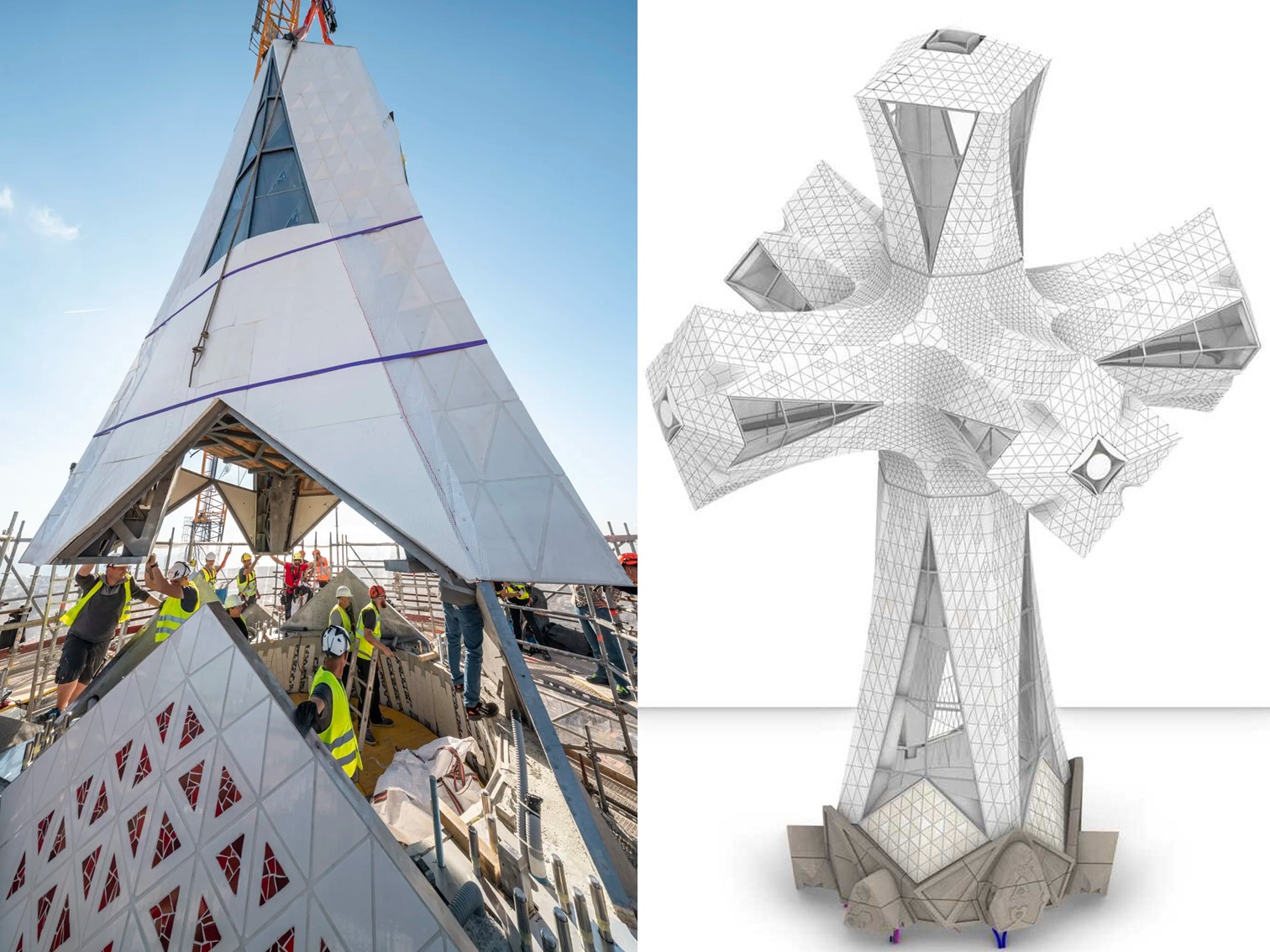 Auf die Sagrada Familia wird ein begehbares Kreuz aus Duplexstahl, Ultra-Hochleistungsbeton (UHPC) sowie einer transparenten und transluzenten Verglasung, die teilweise pyramidenförmig und gebogen geformt ist, aufgesetzt. So entsteht der höchste Kirchturm der Welt. Die Idee der 17m hohen, außen mit hellen Fliesen sowie Keramikplatten bestückten und innen mit Naturstein bekleideten Konstruktion stammt vom katalanischen Baumeister Antoni Gaudi.