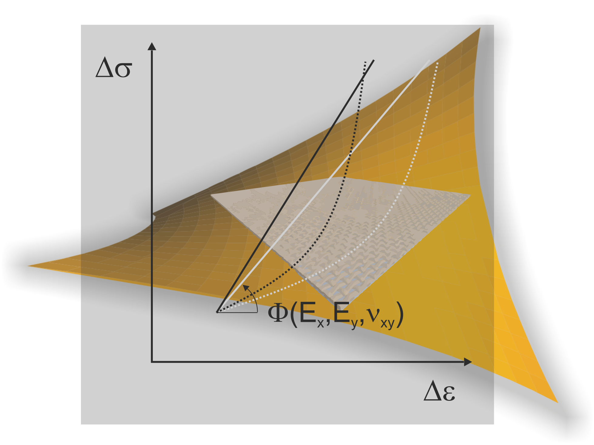Für das vorgestellte iterative Verfahren wird ein Anfangssatz elastischer Konstanten verwendet. In jedem Iterationsschritt werden die Verhältnisse der Spannungen in x- und y-Richtung in allen Elementen überprüft und die Materialkonstanten jedes Elements entsprechend diesem Verhältnis optimiert. Auf diese Weise werden zahlreiche Sätze elastischer Konstanten angewendet, was die Materialmodellierung für Textilien auf einfache Weise verbessert.