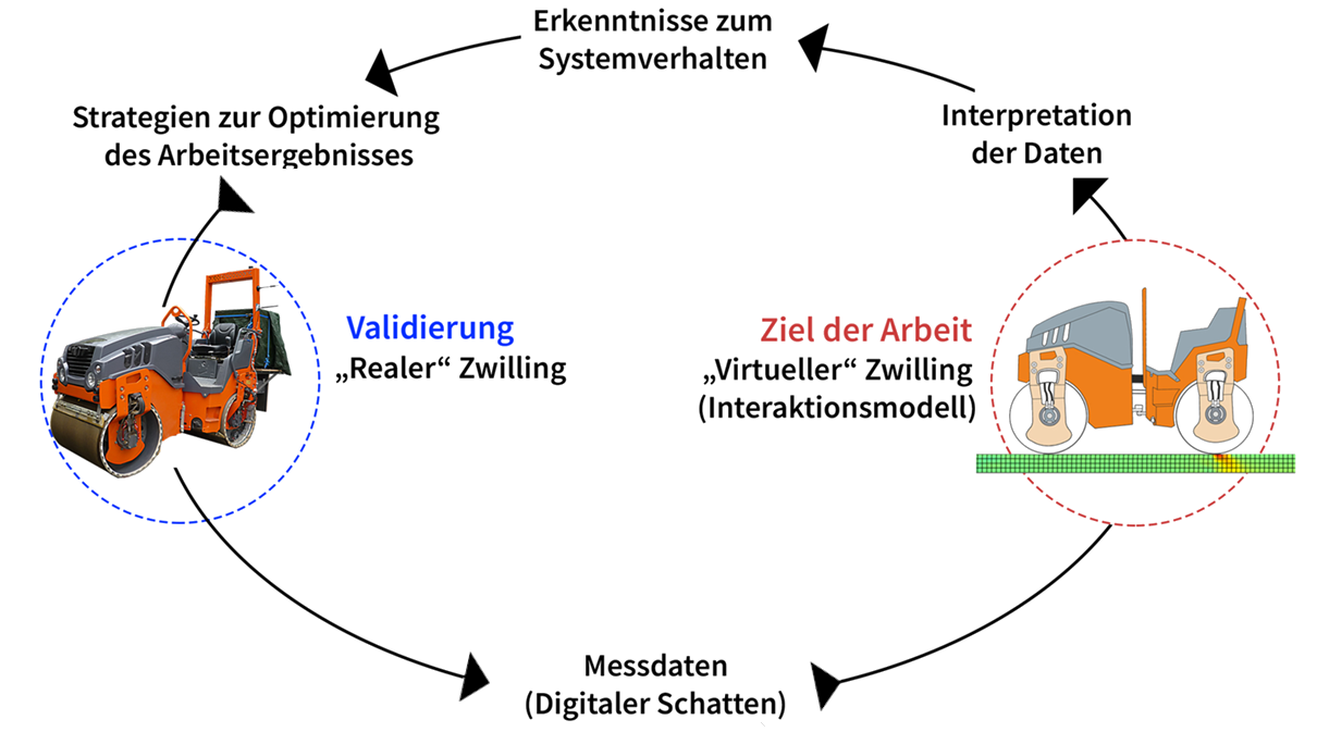 Die Digitalisierung bildet die Grundlage für (teil-)automatisierte Abläufe. Viele relevante Prozessinformationen liegen bislang nur analog und punktuell vor. Die kontinuierliche digitale Erfassung von Materialkennwerten entlang des Stoffstroms erlaubt eine gezielte Übergabe an nachgelagerte Prozessschritte und damit eine adaptive Maschinensteuerung. Dies erhöht die Effizienz, verbessert die Verarbeitung des eingebauten Materials und unterstützt nachhaltige Bauweisen. Zudem liegen in der Automatisierung Möglichkeiten, Arbeiter von potentiell gefährlichen Situationen fernzuhalten.