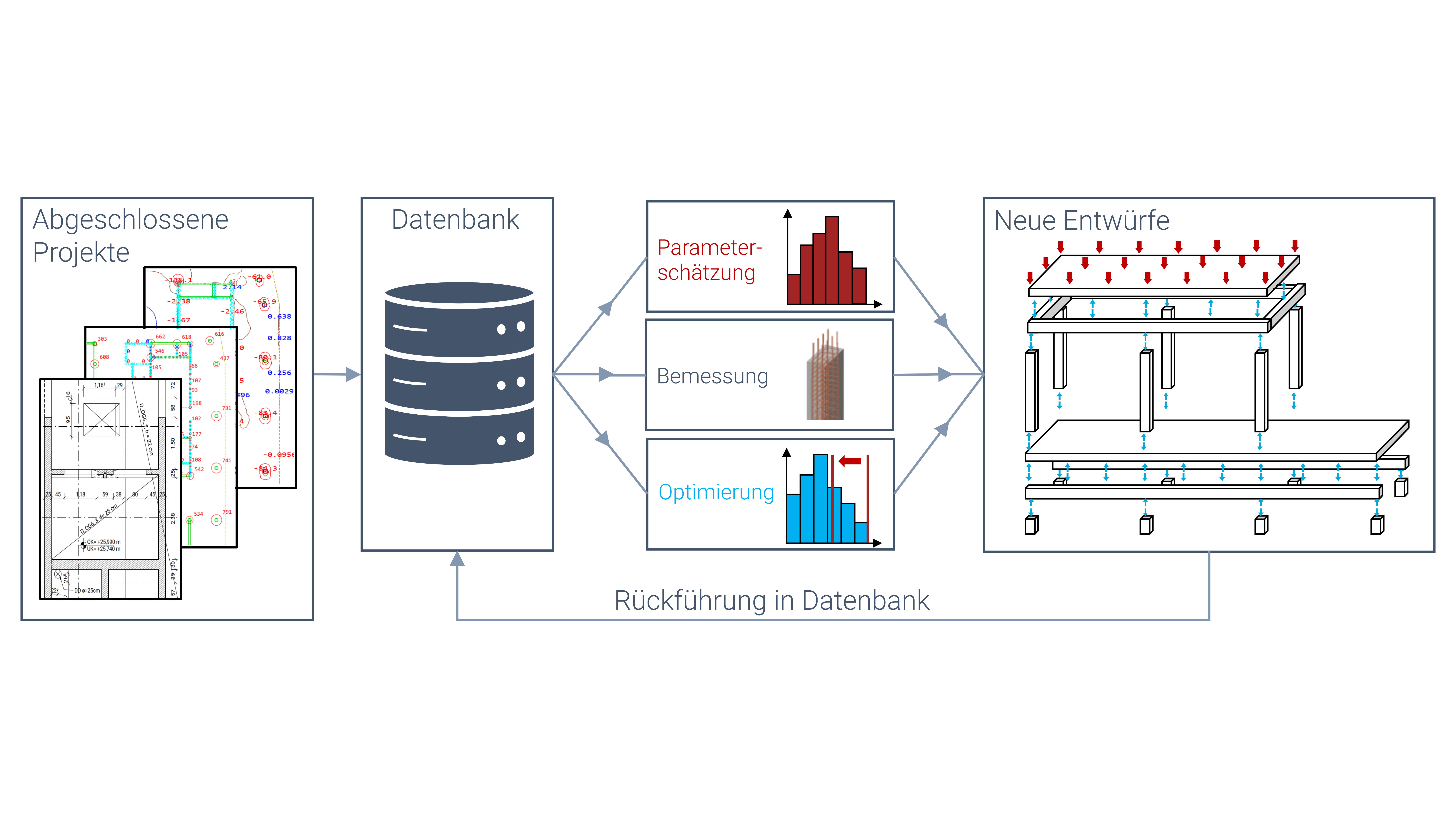 Über das Potential der Daten wird im Kontext von Digitalisierung, BIM und KI viel diskutiert, meist ohne zu definieren was „Potential“ und „Daten“ konkret bedeuten. Die ZM-I Gruppe, STR.UCTURE, GRBV Ingenieure im Bauwesen, das Sailer Stepan Tragwerkteam, Bollinger + Grohmann, sowie das LSD (TUM) und ISD (TUBS) sind überzeugt, dass sich aus den Statiken, Modellen und Plänen der Ingenieurbüros strukturierte Informationen über die Tragwerke auf Bauteilebene erheben lassen, die das Potential haben, den Entwurf, die Bemessung und die Optimierung von Tragwerken in erheblichem Maße voranzubringen. Konkret wird von den genannten Partnern die Bauteildatenbank SEDD (Structural Element Design Database) aufgebaut, welche Daten über die Projekte (Baujahr, Fläche, Geschosszahl…) sowie über jedes der verbauten Bauteile (Position im Tragwerk, Geometrie, Material, Last, Bemessungsergebnis) enthält. Aus diesen strukturierten Daten lassen sich sowohl schnell und effizient Parameter für die Vor- und Entwurfsplanung schätzen, Bauteile in Masse „auf Knopfdruck datenbasiert“ bemessen, als auch, ohne Mehraufwand, optimierte Entwürfe durch Abfrage in der Datenbank einsehen. Die jahrzehntelange Erfahrung der Tragwerksplanenden kann so systematisch konserviert und wiederverwendet werden. Für den Einsatz in der Praxis konzipiert, schlägt SEDD, als Datenbasis für weiterführende Forschung und zum Training von KI-Modellen, die Brücke zurück in die Forschung.