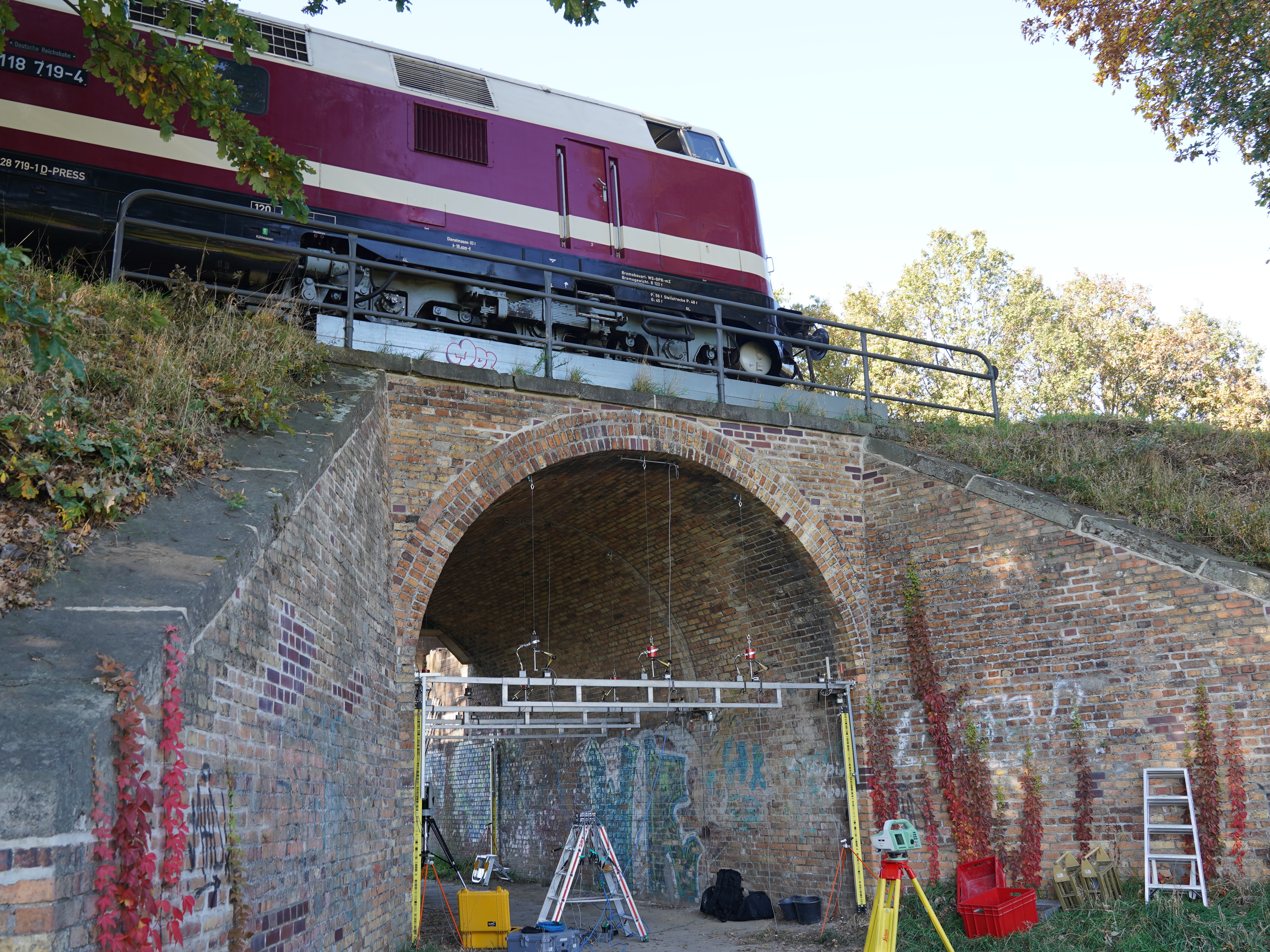 Gewölbebrücken sind ein wichtiger Bestandteil und gleichzeitig die älteste Bauart im Schienennetz der Deutschen Bahn. Der Erhalt dieser Bauwerke erfordert einerseits zielgerichtete Sanierungsmaßnahmen sowie andererseits den Nachweis der Tragfähigkeit. Durch die Ergebnisse einer Reihe von Belastungsversuchen können FE-Modelle kalibriert, maßgebende Einwirkungen identifiziert und somit realistische Bemessungskonzepte abgeleitet werden.