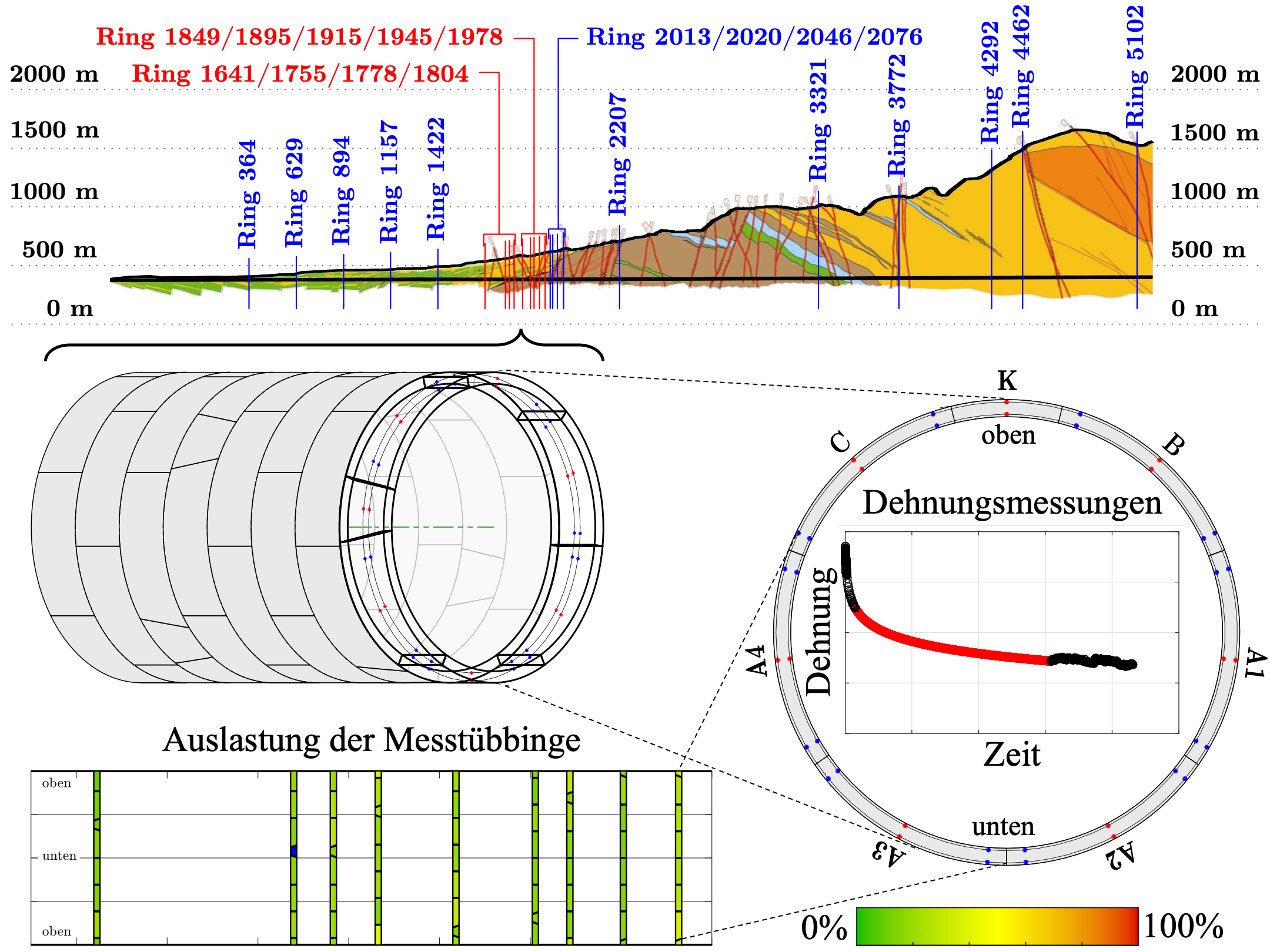 Die Tunnelschale im Baulos 3 des Koralmtunnels besteht aus vorgefertigten Stahlbeton-Tübbingen. Einzelne Messringe, bestehend aus sieben Tübbingen, sind mit Dehnungsmesssensoren ausgestattet, um die Verformung der Tübbinge in Umfangsrichtung zu erfassen. Die Messdaten werden unter Anwendung eines viskoelastischen Modells für gut aushydrierten Beton in Normalspannungen und zugehörige Auslastungsgrade der Tübbinge übersetzt.