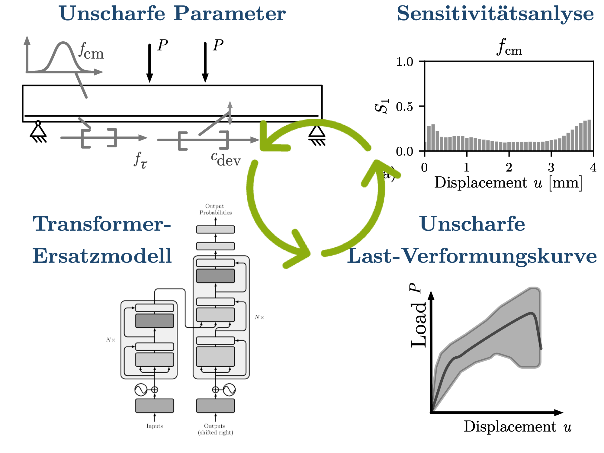 Die Tragfähigkeit und Rissentwicklung von Stahlbeton- und Faserbetonträgern wird maßgeblich durch Material- und Konstruktionsunschärfen beeinflusst. Ein neu entwickeltes Transformer-Ersatzmodell ermöglicht schnelle Vorhersagen von Last-Verformungs- und Rissverläufen. Anhand dieses Ersatzmodells werden Sensitivitätsanalysen der unscharfen Parameter durchgeführt und Planer beim Tragwerksentwurf unterstützt.