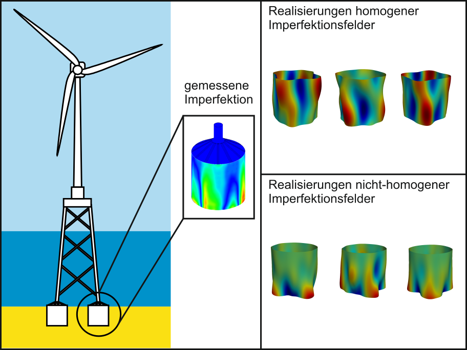 Suction-Buckets finden zunehmend Anwendung als Fundamente für Offshore-Windenergieanlagen. Fertigungsbedingte geometrische Imperfektionen haben einen starken Einfluss auf das Beulverhalten dieser dünnwandigen Kreiszylinderschalen. Auf Basis experimenteller Daten werden Unschärfen mittels eines nicht-homogenen Zufallsfeldansatzes quantifiziert. Die Ergebnisse stochastischer Beulanalysen zeigen das Potenzial für wirtschaftlichere Konstruktionen.